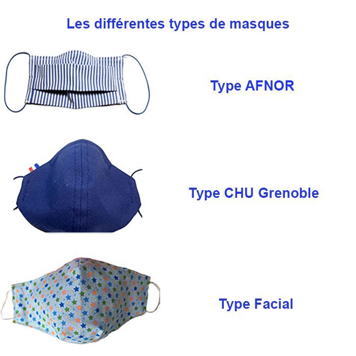 Masque barrière en tissu lavable. de catégorie 2 Je vous propose 3 modèles de masques : - Type AFNOR - Type CHU de Grenoble - Type Facial (recouvre davantage le visage). Clip de serrage sur les élastiques afin d'ajuster au mieux derrière les oreilles. Le masque barrière n'est pas un dispositif médical. Il ne remplace en aucun cas les gestes barrières Masque lavable au moins une dizaine de fois en machine à 60°. Attention, ne pas repasser l'étiquette Maman m'a dit..., les élastiques et la broderie si vous en avez fait faire une. 4 Tailles de masque : - T1 : Enfant de 3 à 9 ans - T2 : Ado et femme mince - T3 : Femme - T4 : Homme Possibilité de broder un prénom et/ou un motif.