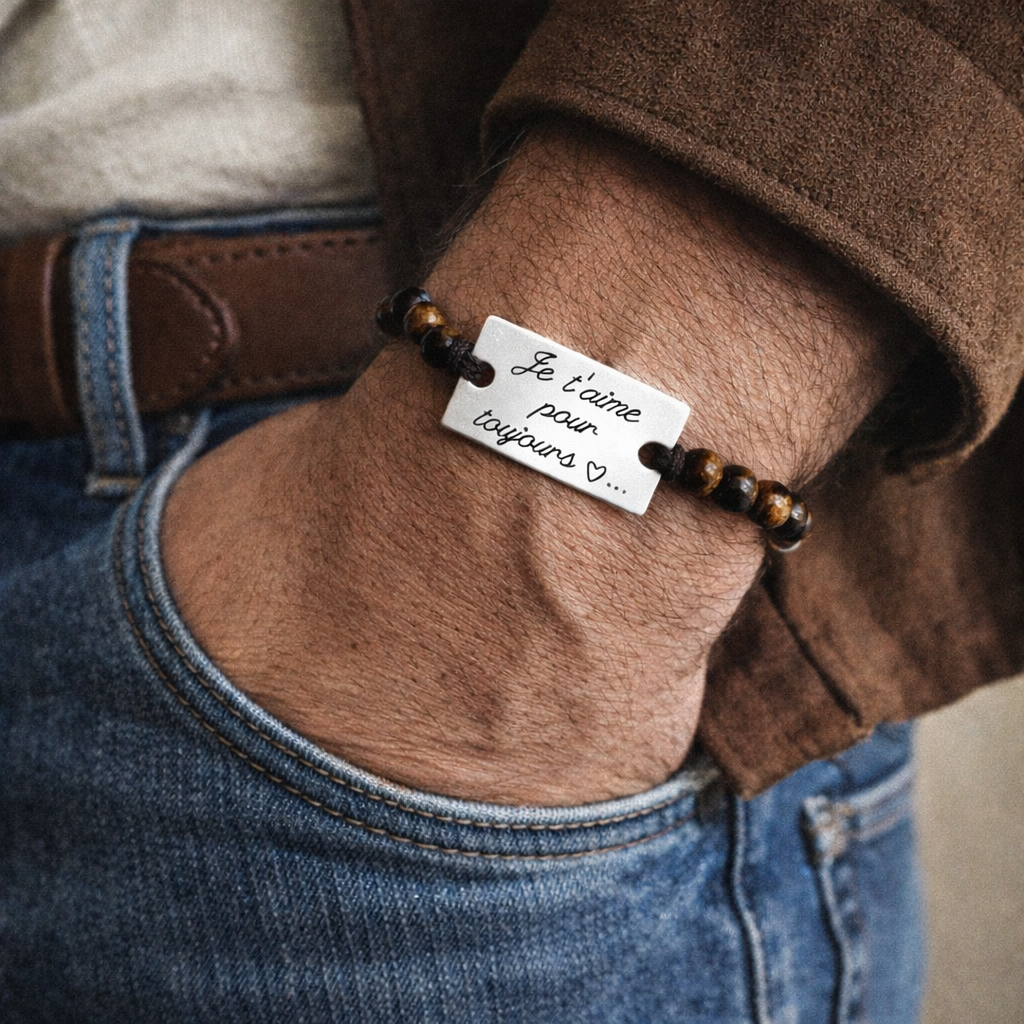 Bracelet  medaille 15x25 mm gravures au choix, sur la photo oerles 6mm œil de tigre mais vous pouvez choisir d'autres perles