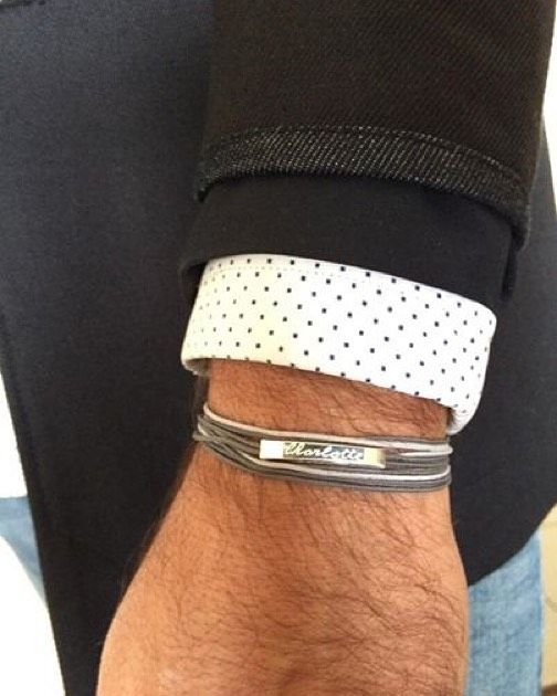 Voici le bracelet préféré des hommes, celui qui ne ressemble pas aux autres, et tellement élégant au poignet.. La barrette en argent massif mesure 4 x 26 mm, elle est montée sur 3 cordons polyesters épais (vous pouvez donc cocher jusqu'à 3 couleurs.) Fermeture par mousqueton, 3 tours au total et vous conservez 2 noeuds coulissants afin d'ajusuter la longueur. Les cordons ne sont pas fragiles, vous pouvez vous laver et dormir avec. Possibilité de graver les 4 faces (merci de me les indiquer dans les commentaires) : - la 1ère correspond à celle du haut (visible), - la 2éme sur un coté - la 3éme dessous - la 4éme sur un coté